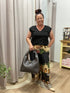 Lacassa Carnival Print Black matching set features a whimsical design with elephants, horses, and lush foliage on luxurious 80% viscose and 20% silk blend. The collarless top showcases a flattering v-neck and puff sleeves, while elasticated cuffs add refined detail. Wide relaxed-fit pants provide comfort and ease of movement. This size-inclusive set drapes beautifully on all body types—model pictured wears size small-medium. Perfect for warm weather styling, the natural fabric blend offers breathability and gentle care. Playful, premium, and effortlessly elegant.